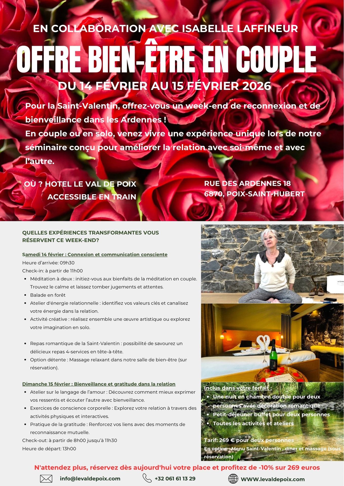 Compris dans le forfait: Séjour de 2 nuits en chambre double standard avec petit-déjeuner Activité Bien-Être : Le jeudi, Balade en forêt, méditation, automassage ou atelier Repas gastronomique : un menu 3-services chaque soir. Pass activité Le Val de Poix : Profitez de 10% de réduction sur l’entrée de 4 attractions incontournables de la région : le Mudia Museum, le Bastogne War Museum, l’Euro Space Center et les Grottes de Han.